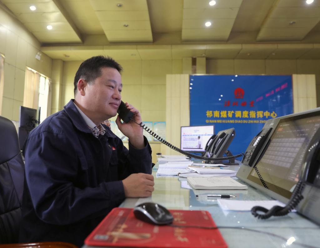 調(diào)度員余勇敢正在接聽井下生產(chǎn)電話。“要嚴(yán)格落實(shí)礦主要領(lǐng)導(dǎo)的要求,淡化節(jié)日氛圍,抓好安全生產(chǎn),我們是礦安全生產(chǎn)的中樞,更是不能有絲毫大意。”