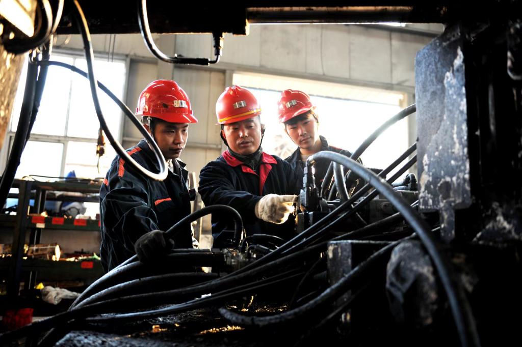 杲志(中間)在為職工講解鉆機(jī)維修知識