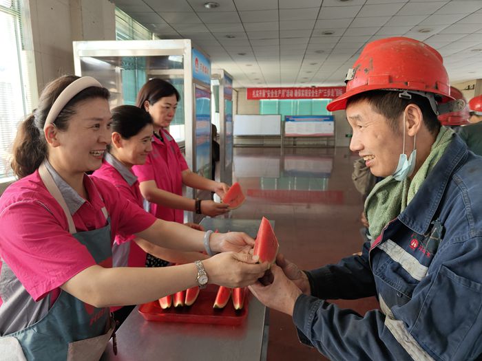 近日,在祁南礦井口大廳,該礦協(xié)安員大聲吆喝著剛升井的職工吃瓜解暑,一群高溫下堅(jiān)守崗位的職工趁著交接班的空檔,手拿大西瓜,大家你一言我一語地說著話,無不稱贊著送清涼這場“及時(shí)雨”。