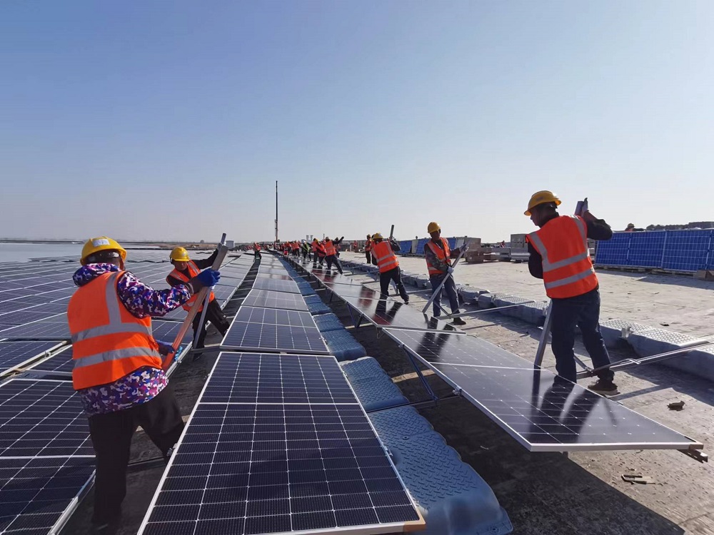 淮北礦業(yè)集團加快發(fā)展光伏“綠電”戰(zhàn)新產業(yè)補鏈項目。在面積達94公頃的袁店一礦84兆瓦集中式水面光伏項目現場,120名職工分成6個班組,從南北兩岸正加快施工。“項目建成后,平均每年提供綠色電能9311萬千瓦時,相對火力發(fā)電,每年節(jié)省標煤2.84萬噸,相應減少排放二氧化碳7.58萬噸。”該光伏項目建設負責人秦忠原介紹。