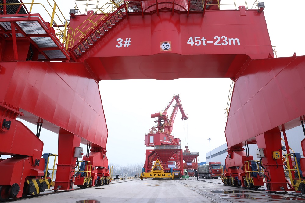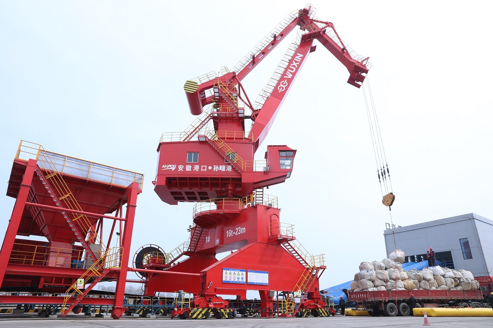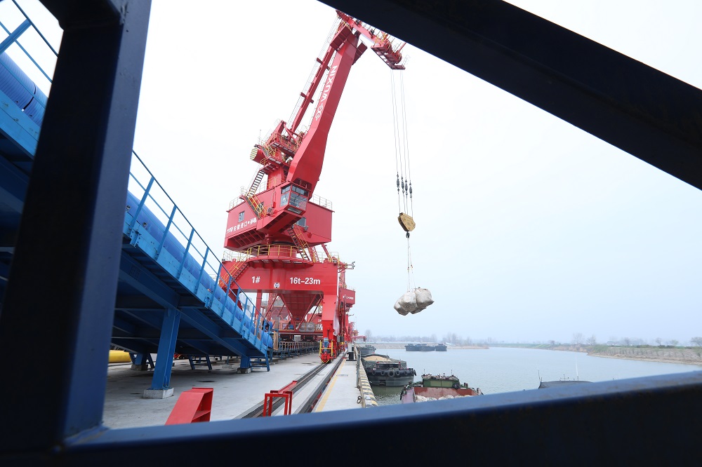 3月26日,記者來到淮北市濉溪縣孫疃港,現(xiàn)場起重機、多用途門機、移動式裝船機屹立在澮河岸邊正在吊運貨物,一派忙碌的景象。