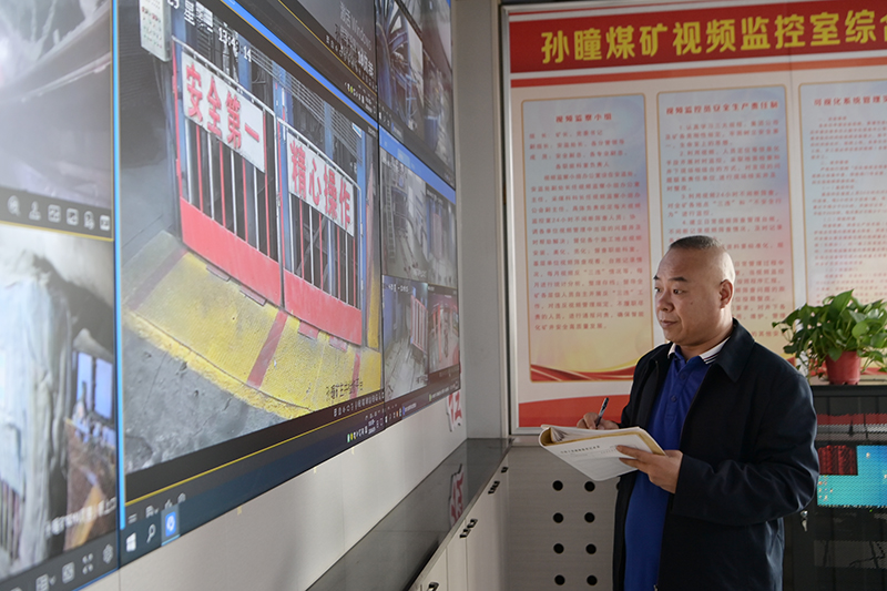 在該礦視頻監(jiān)控室,面對(duì)6塊監(jiān)視大屏的24個(gè)作業(yè)點(diǎn),安監(jiān)員王建兩眼來(lái)回逡巡,緊盯屏幕,認(rèn)真觀察每一個(gè)作業(yè)場(chǎng)所的規(guī)范作業(yè)情況,時(shí)而在隱患登記簿上記錄,時(shí)而拿起電話聯(lián)系,為礦井守好安全生產(chǎn)的第一道關(guān)口忙得不亦樂乎。