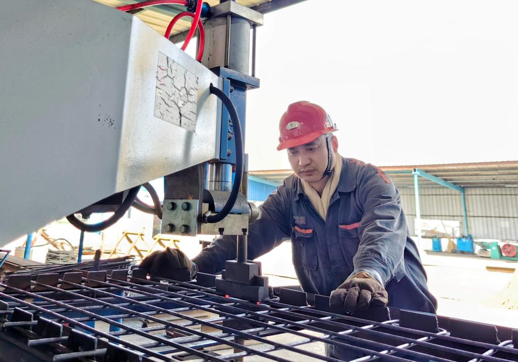 圖為機(jī)電科支護(hù)工趙永羅正在焊制鋼筋網(wǎng)
