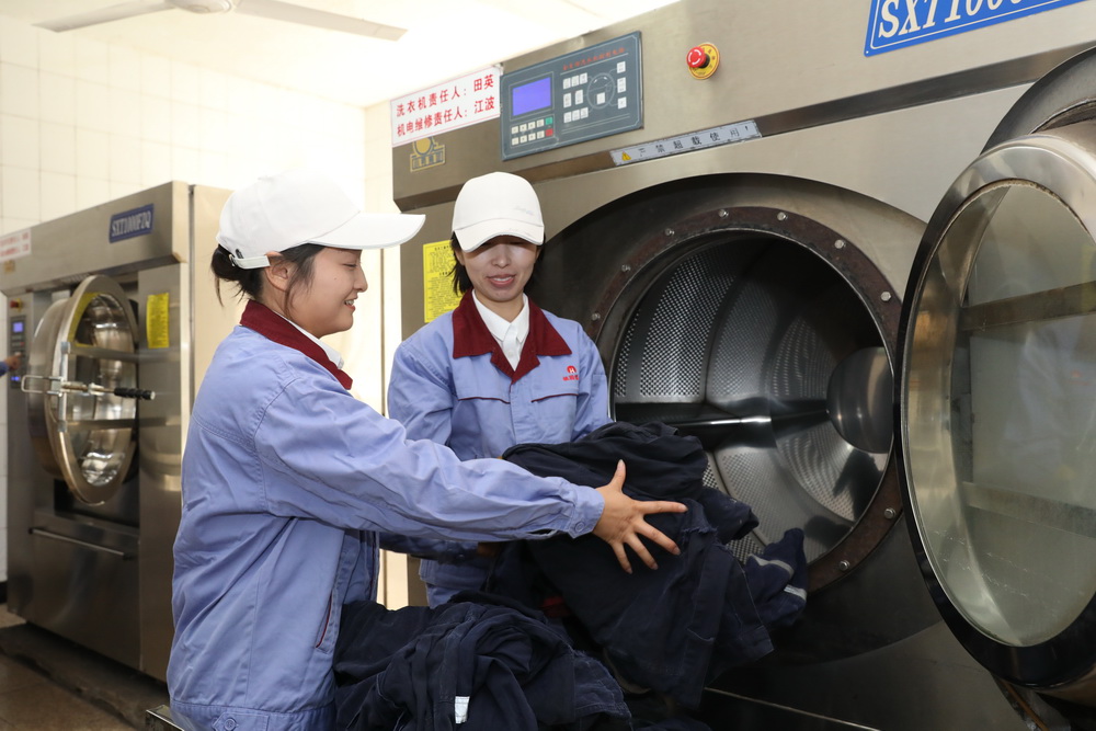 該礦物業(yè)管理科洗衣房女工趙文芳、李程程清洗工作服。