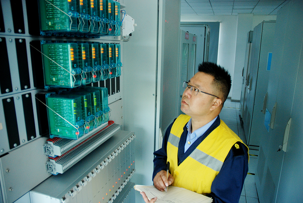 圖為臨渙電務(wù)段信號(hào)領(lǐng)工區(qū)領(lǐng)工長(zhǎng)石磊查看信號(hào)聯(lián)鎖機(jī)房信號(hào)集中監(jiān)測(cè)系統(tǒng)運(yùn)行情況