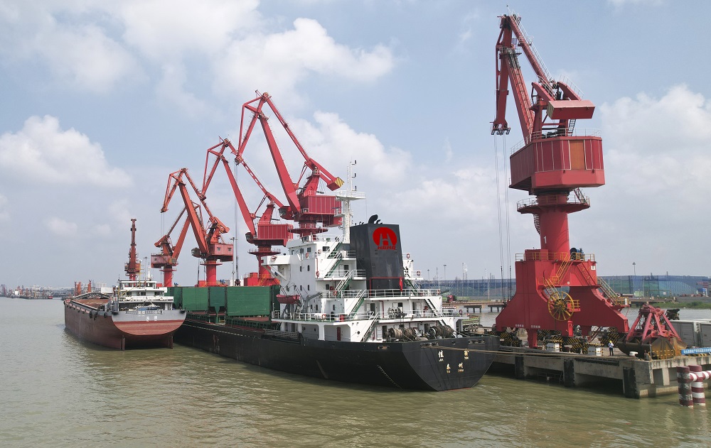 南京航運(yùn)公司貨船正在港口裝運(yùn)煤炭。(李曉亮 攝)