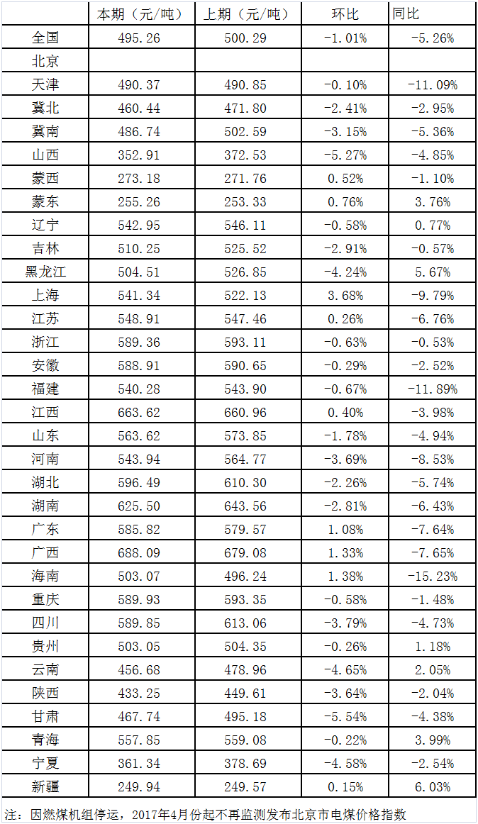 2019年5月15日,國(guó)家發(fā)展改革委價(jià)格監(jiān)測(cè)中心公布4月中國(guó)電煤價(jià)格指數(shù)為495.26元/噸,環(huán)比下行1.01%,同比下降5.26%。其中,監(jiān)測(cè)的31個(gè)省市(不含北京市)中,價(jià)格下行地區(qū)數(shù)量有22個(gè),下行幅度減弱至27.44元/噸以內(nèi);其他9個(gè)地區(qū)電煤價(jià)格全部上行,漲幅上行至19.21元/噸以內(nèi)。本月全國(guó)煤炭?jī)r(jià)格活動(dòng)范圍整體上移,且煤炭?jī)r(jià)格上下行地區(qū)數(shù)量比例基本維持,說(shuō)明價(jià)格下行區(qū)域活力減弱,而上行幅度擴(kuò)大。